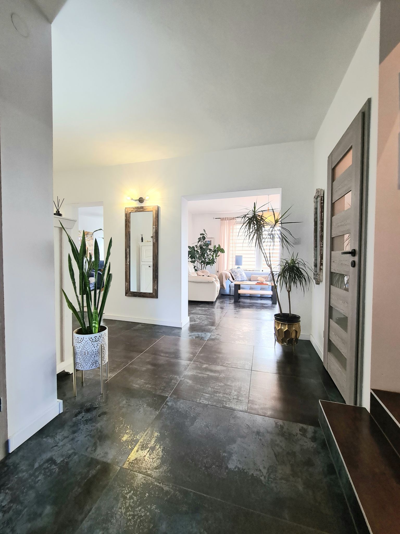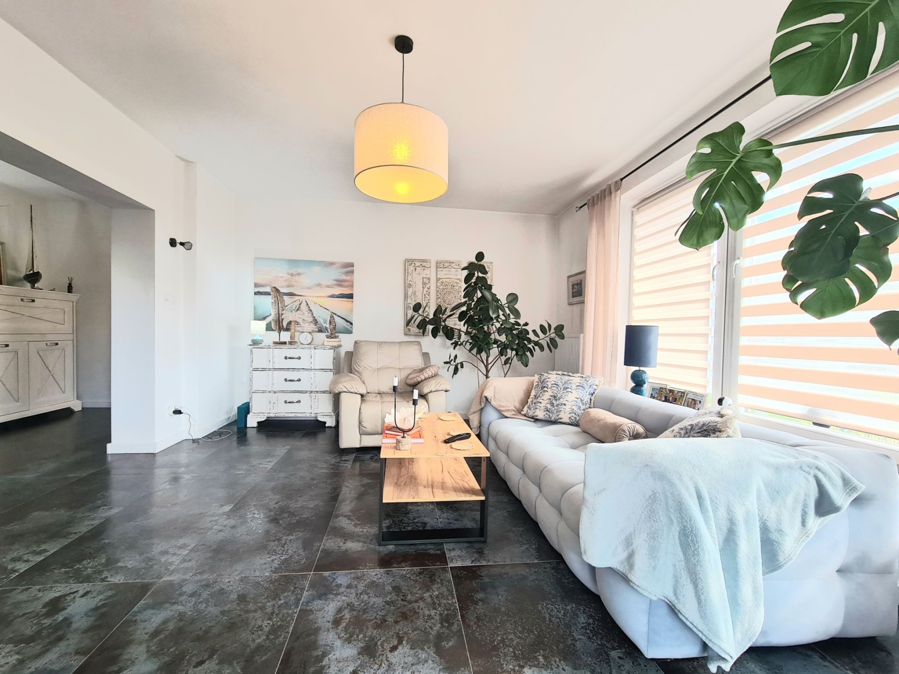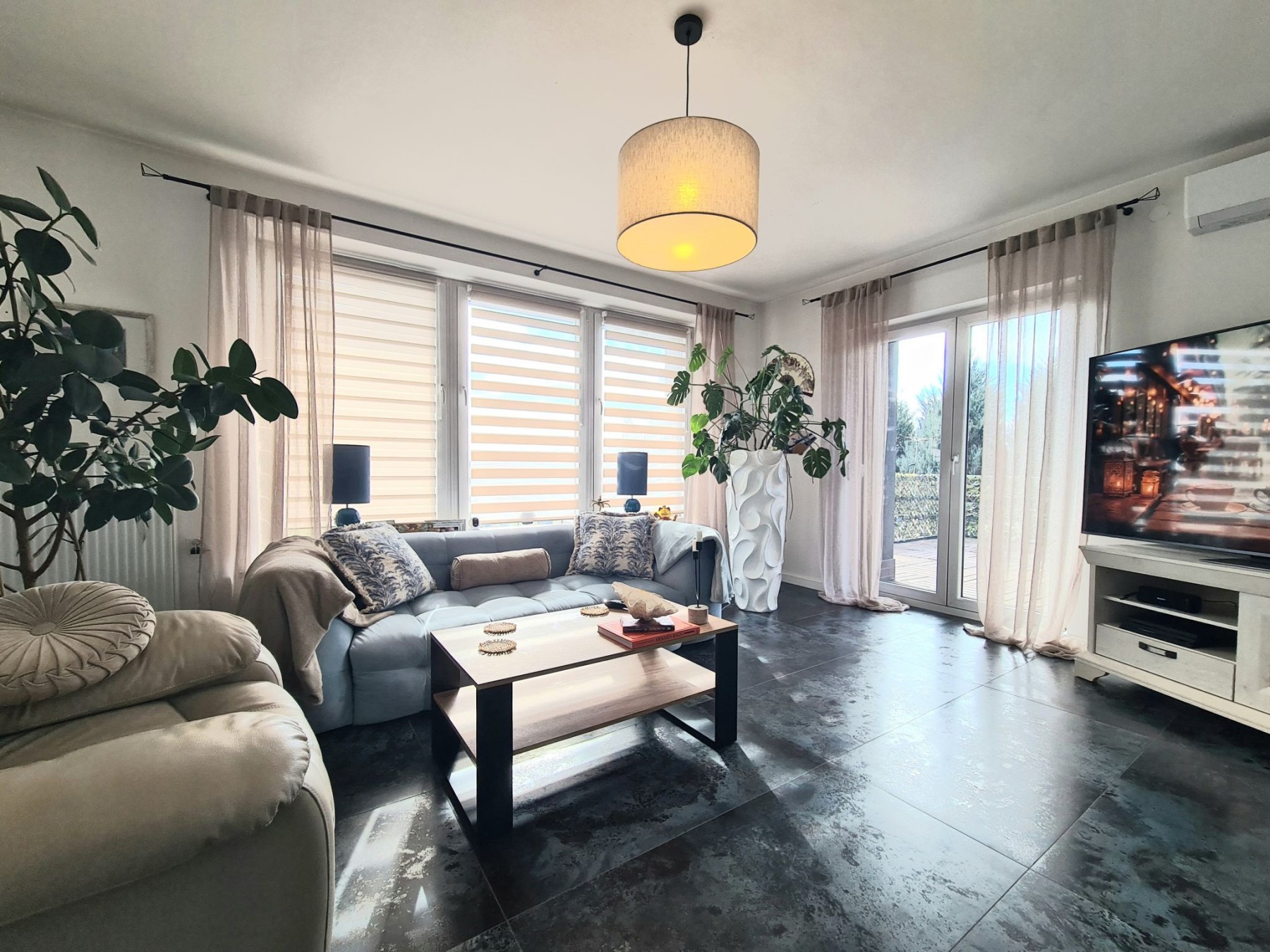 przestronny salon z wyjściem na duży, pięknie zaaranżowany taras