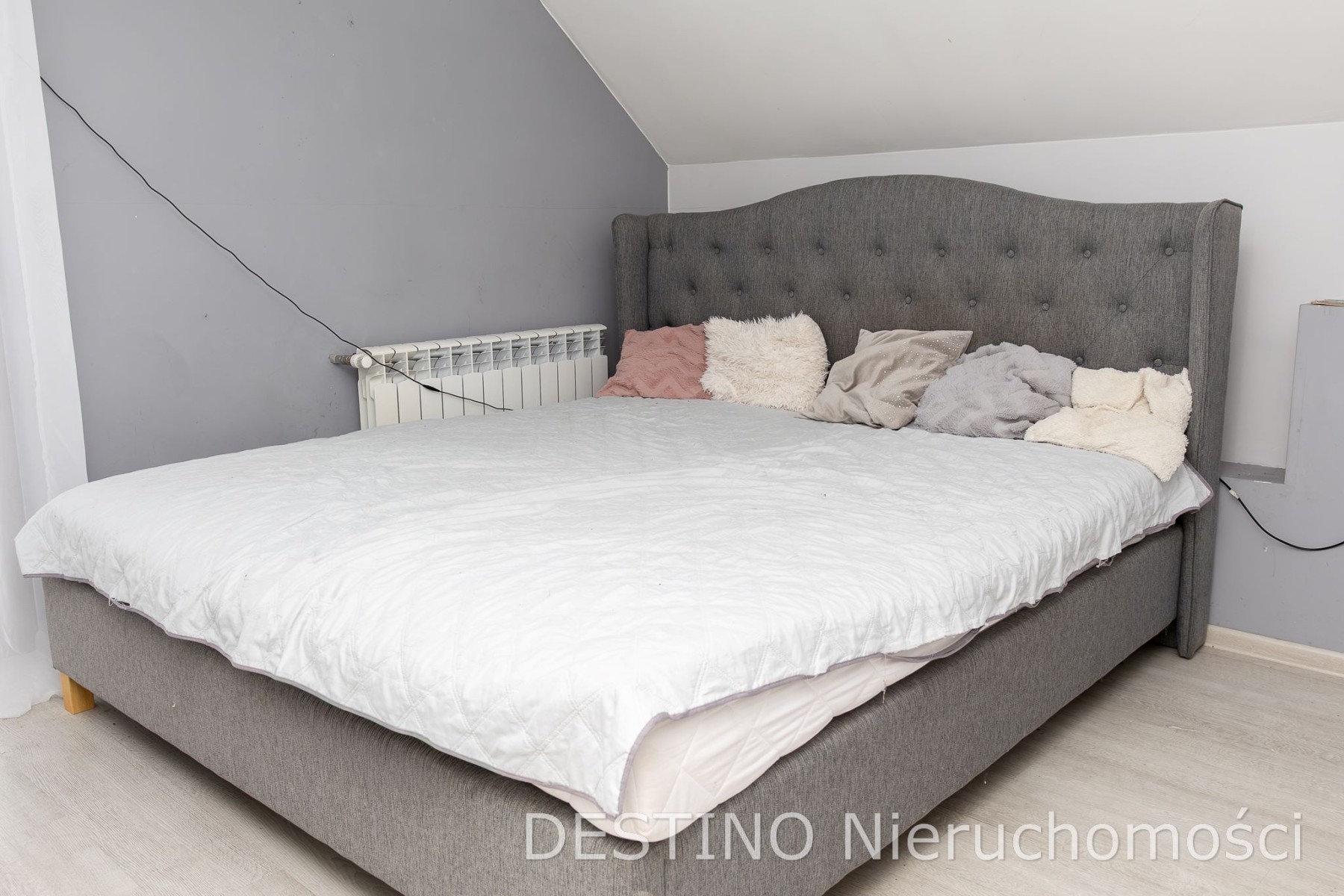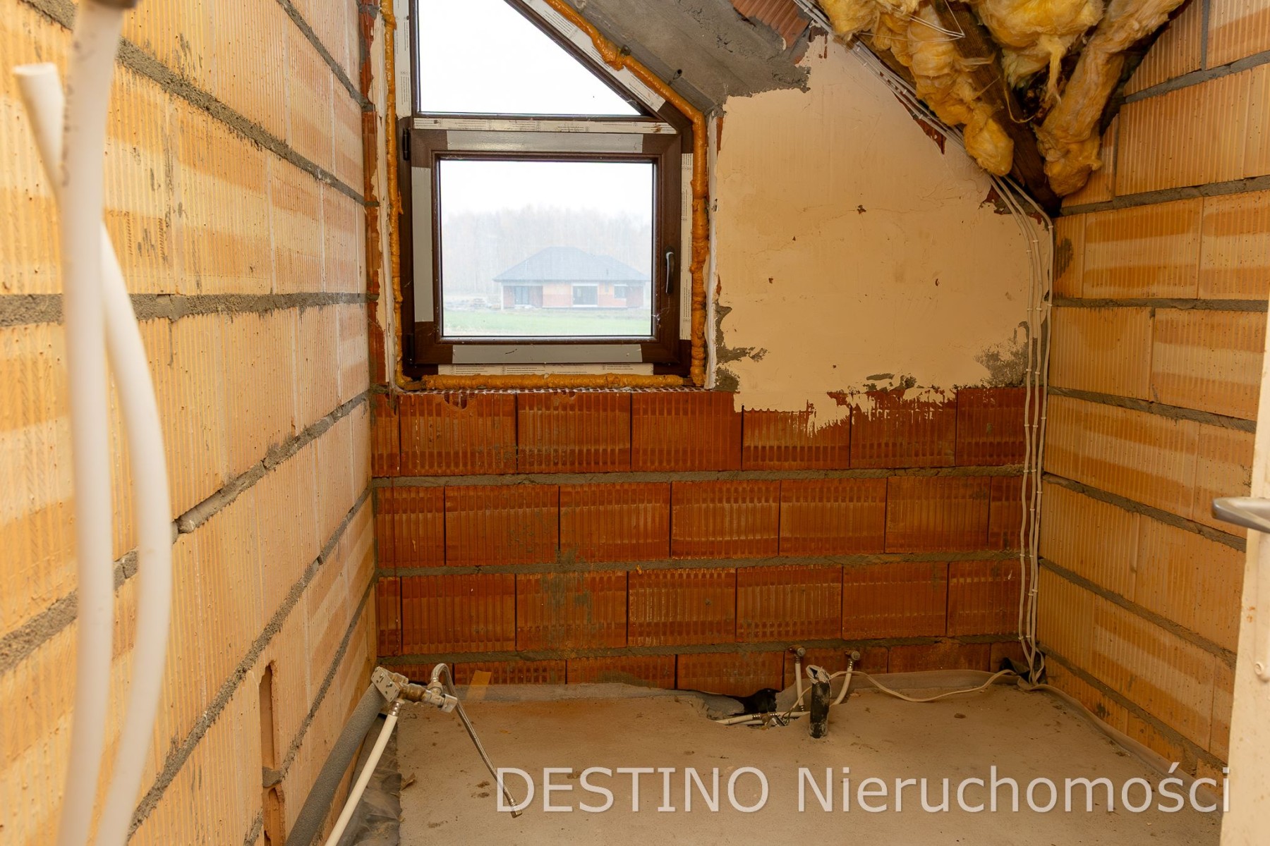 Układ domu : parter - salon z kominkiem, kuchnia, komunikacja, holl i łazienka; piętro - trzy sypialnie, łazienka, pomieszczenie gospodarcze, komunikacja. Parter budynku został całkowicie wykończony, na piętrze do wykończenia pozostaje pokój i łazienka.