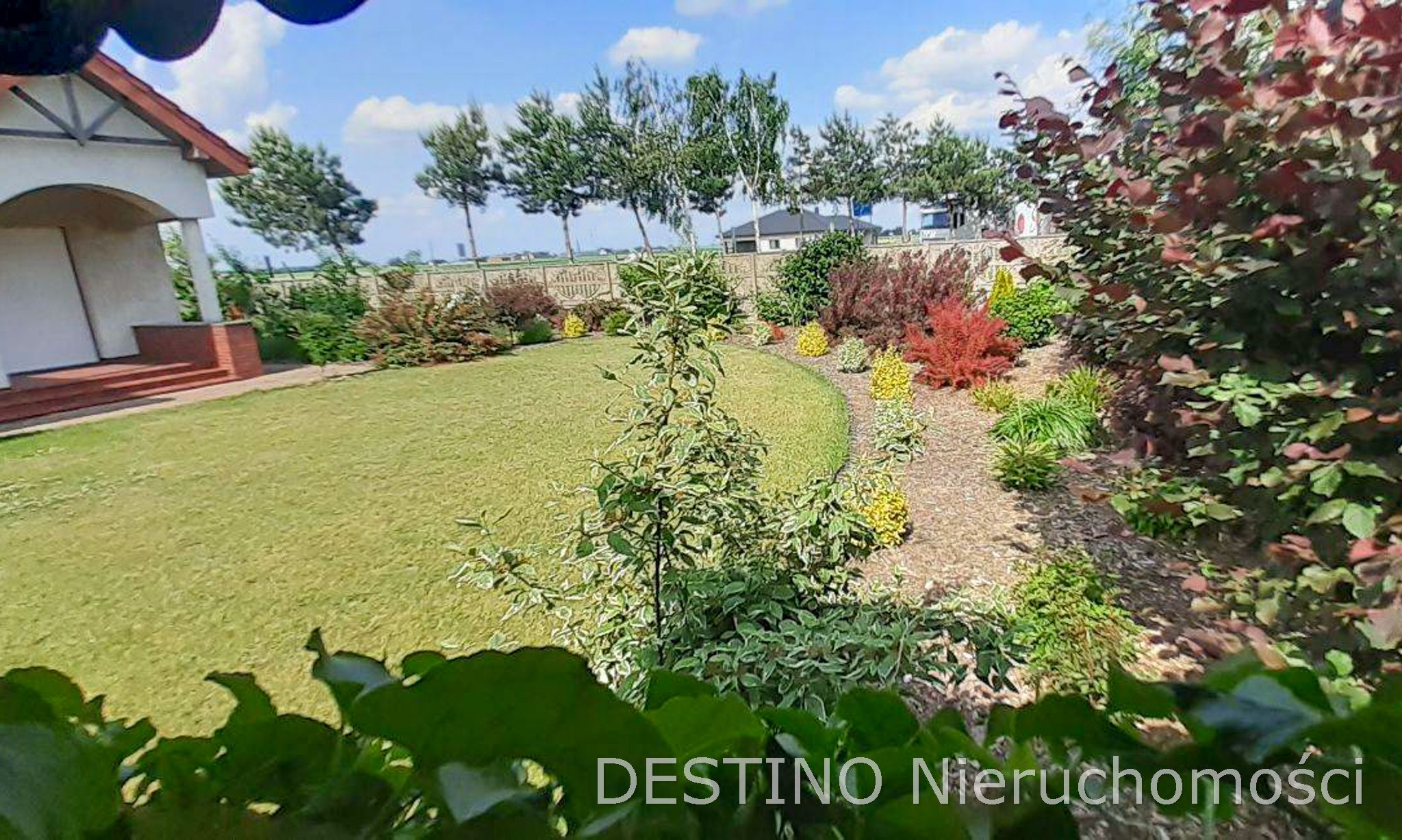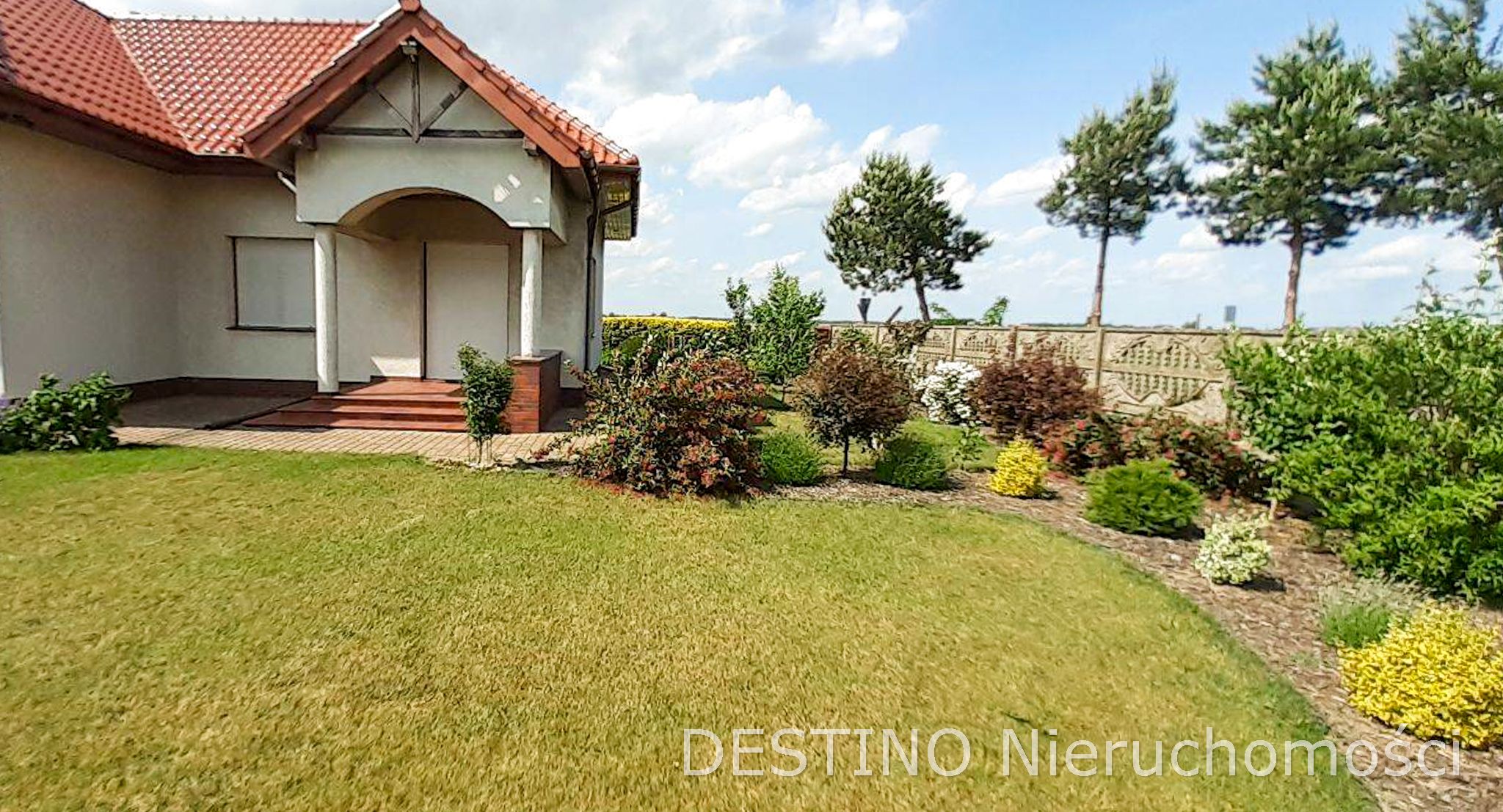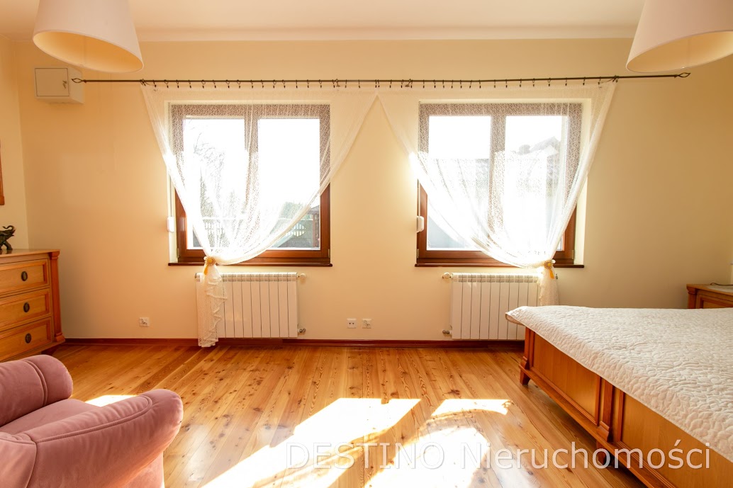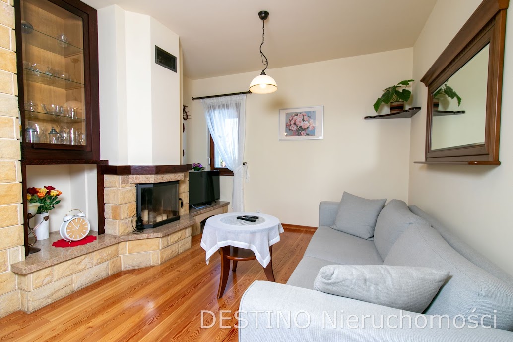 Z salonu wyjście na duży taras, za domem ogród. Teren przed domem i podjazd do drugiego garażu wzdłuż domu wykostkowany. Bramy wjazdowe do garaży oraz brama wjazdowa na posesje automatycznie otwierane. W okolicy inne domy wolnostojące i tereny zielone. Nieruchomość bezpośrednio przy drodze asfaltowej. Dom niezwykle klimatyczny, ciepły w odbiorze i funkcjonalnie zaprojektowany.