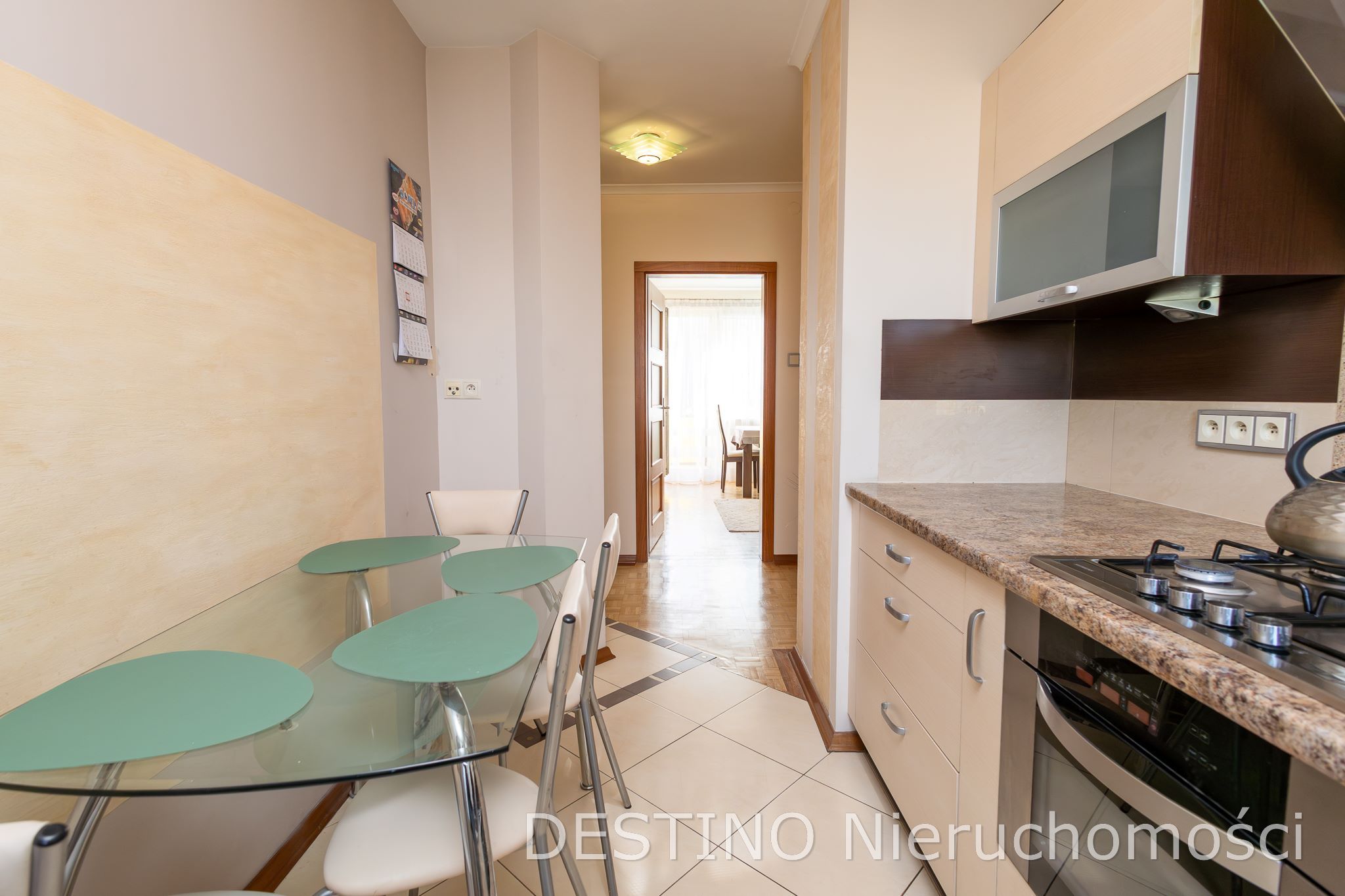 Niezależny rozkład pomieszczeń,kuchnia w zabudowie meblowej z sprzętem AGD ( zmywarka,lodówka,płyta gazowa,piekarnik) oraz stół z krzesłami.