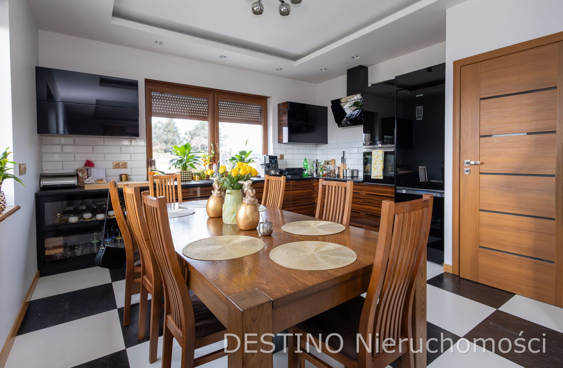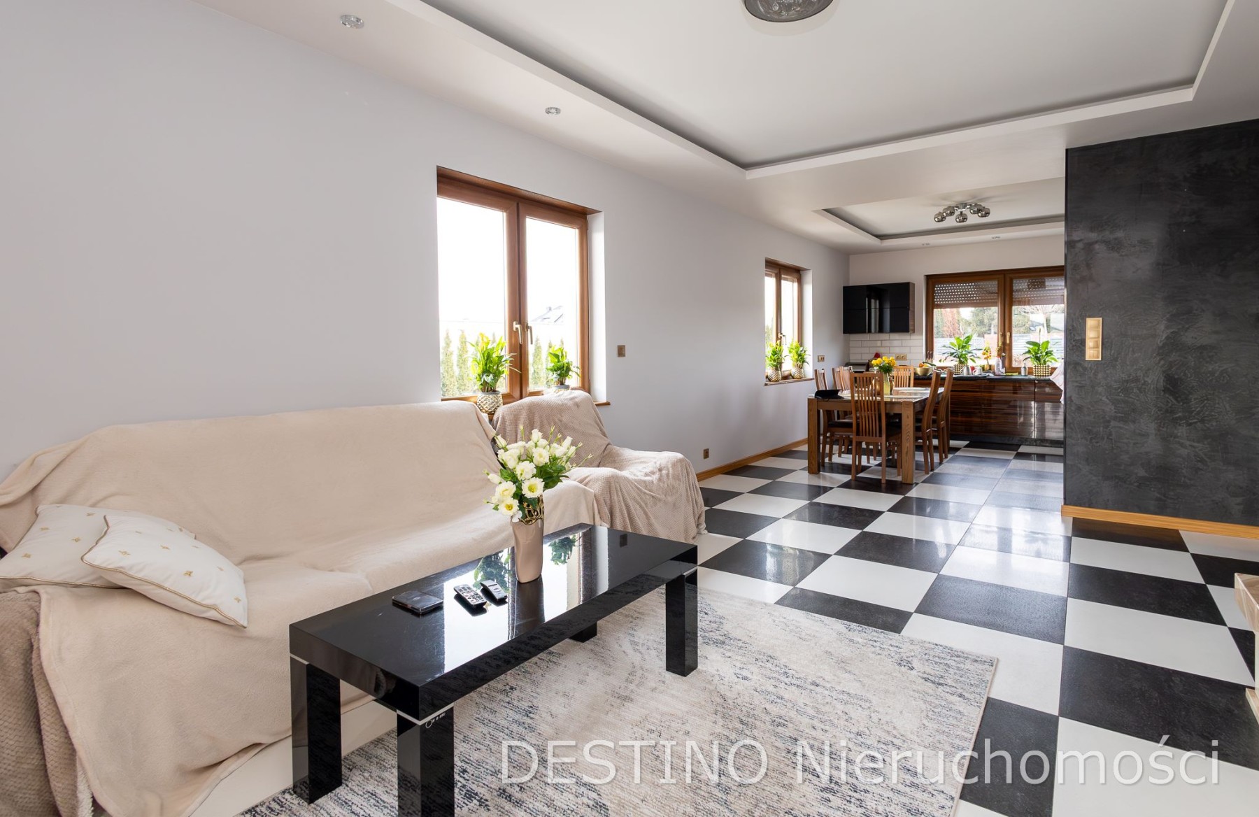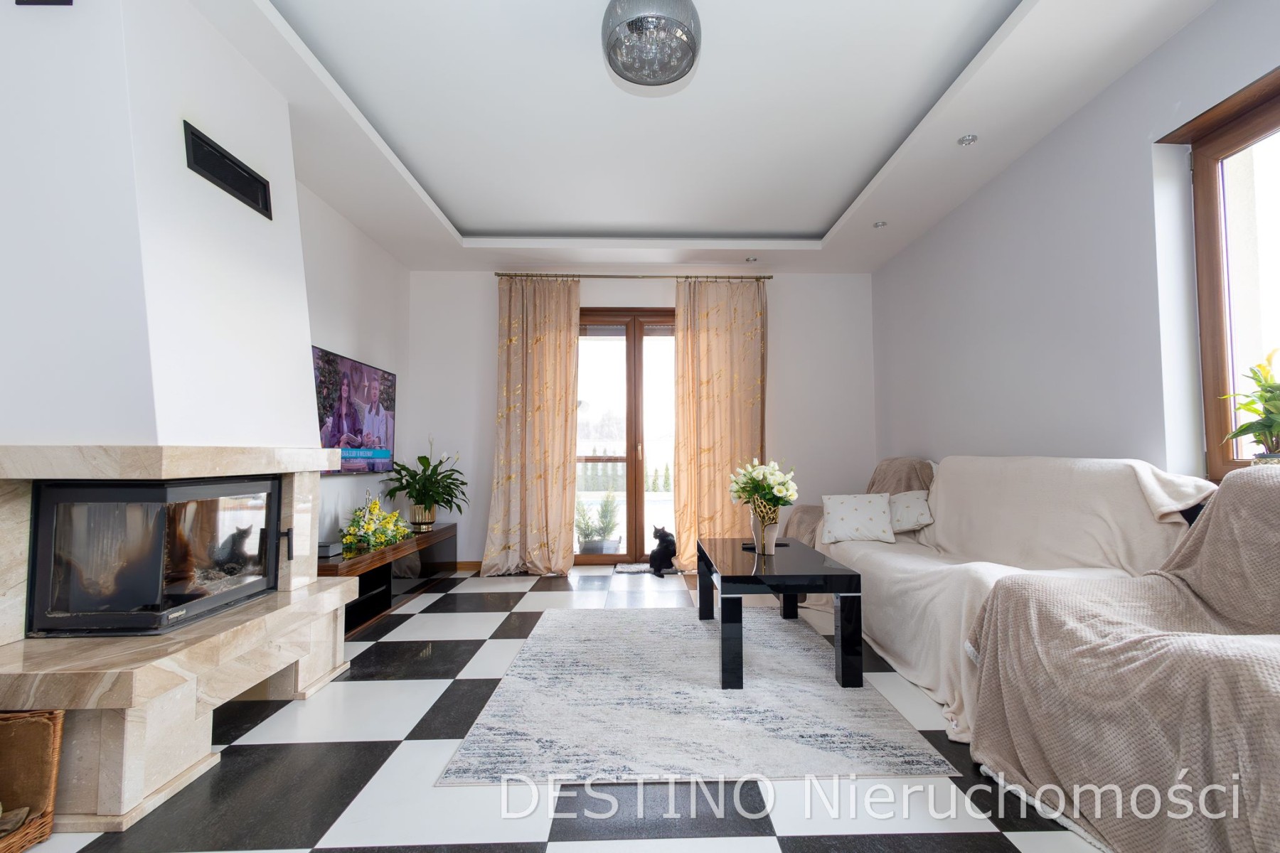 •jasny salon z kominkiem i wyjściem na zadaszony taras,